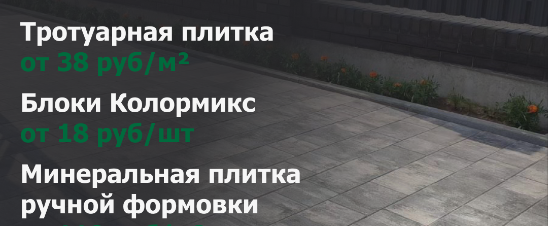 Оформите предзаказ на тротуарную плитку, блоки и минеральную плитку ручной формовки уже сейчас и сэкономьте до 20%! Тротуарная плитка Колормикс 38 руб/м² при 100% предоплате (Экономия 8 руб) 41,50 руб/м² при оплате 50% (Экономия 6,5 руб) В каталог Блоки Колормикс 18 руб/шт при 100% предоплате (Экономия 4,5 руб) 19 руб/шт при оплате 50% (Экономия 3,5 руб) В каталог Минеральная плитка ручной формовки110 руб/м² при 100% предоплате(Экономия 20 руб) 118 руб/м² при оплате 50%(Экономия 12 руб) В каталог Оформите предзаказ сейчас и получите лучшую цену! Предложение действует с 23 сентября до конца февраля. Условия доставки: Доставка предзаказанных партий